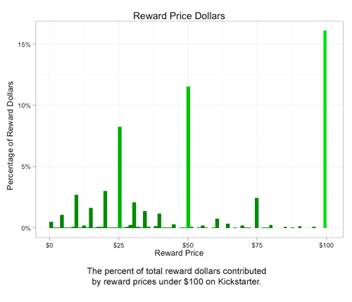 In a striking revelation, it turns out people want to spend less and get more. Also contributing to this data point, in my opinion, is that people are unlikely to spend much on an unproven stranger in most cases. What if they fail? What if they flake? Better to risk a little money in a lot of baskets until you become more comfortable with the idea of crowd funding.