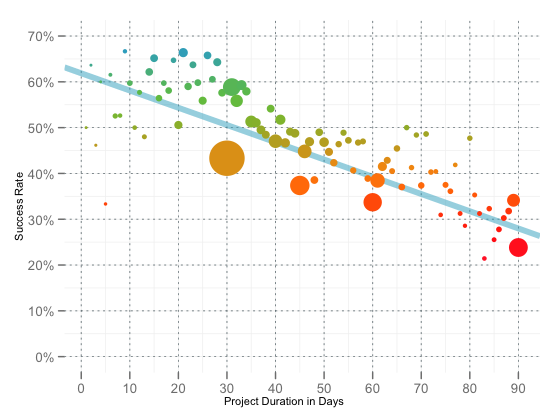According to Kickstarter’s own data, as of June 2011 a random project was 44% likely to get funded, but a really long project (90 days) was only 24% likely to be funded. After discovering this they lowered the maximum length to 60 days. Still, it is important to remember that a bigger isn’t always better; a shorter campaign can have intensity and focus much more likely to be lost during a longer funding drive.