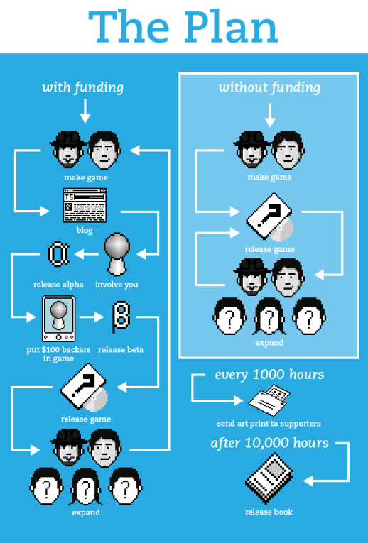 By now I am sure this is starting to sound pretty complicated, but it really isn’t. According to the project creators, for $10 you will get “1,000 hours of everything we create.” This includes, Access to our alphas and betas, Screenshots, Wallpapers, Blog entries, A single-run art print of something we made from the last 1000 hours, and any finished game or games they create in those 1,000 hours. Oh, at you can buy 1,000 hours at a time all the way up to the full 10,000 hour period. The projects pitch says that they expect the whole thing to take about 5 years, so each $10 investment should cover roughly 6 months of updates and professional voyeurism. They even made a flow chart to help: