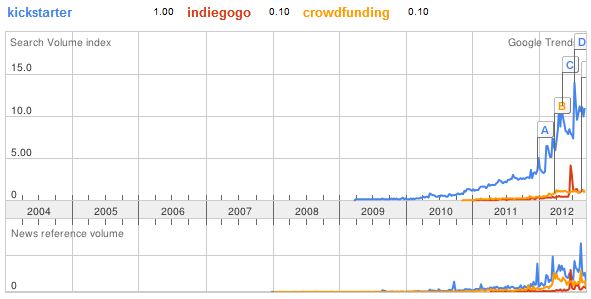 Currently the trajectory of Kickstarter is going only one direction: up. Below is a graph from Google Trends, comparing the search traffic for three key words: Kickstarter, Indiegogo, and crowd funding. This graph is interesting for several reasons: the disparity between the three, the speed of acceleration, and the spikiness.