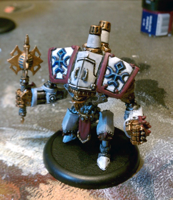 Also this week, we have our first submission from a reader, another friend of mine: Justin. He is painting up a Menoth army, and sent me a picture of his recently finished Crusader.