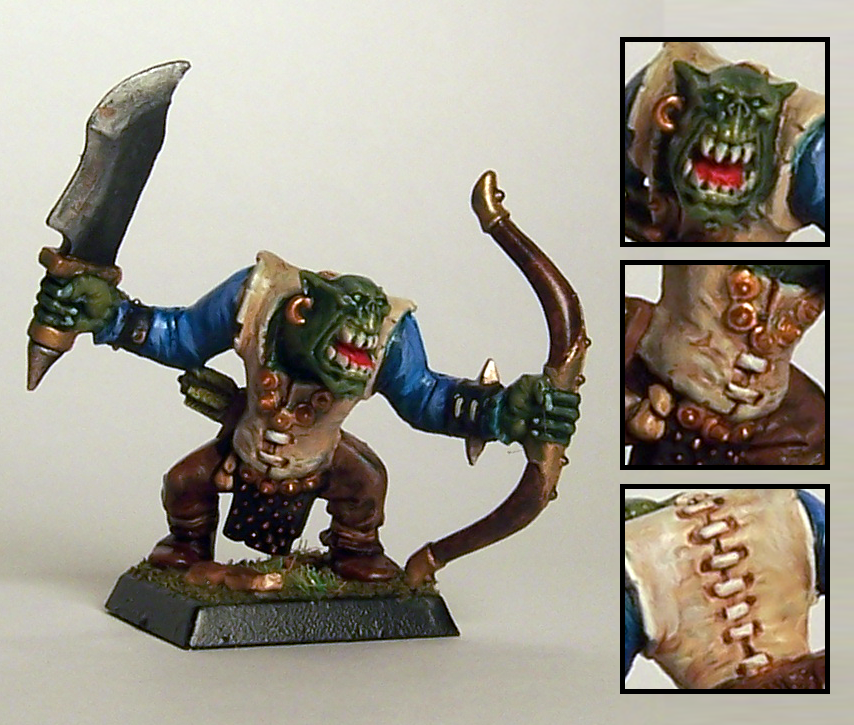 This week Clint sends us another mini, this time it’s a ork. Though I think that the color scheme gives him a bit more credit with hygiene than orks are known for, he did an excellent job painting him. My favorite bits are the back of the shirt for its depth and the sword for its rust.