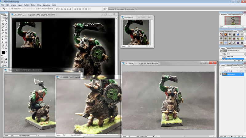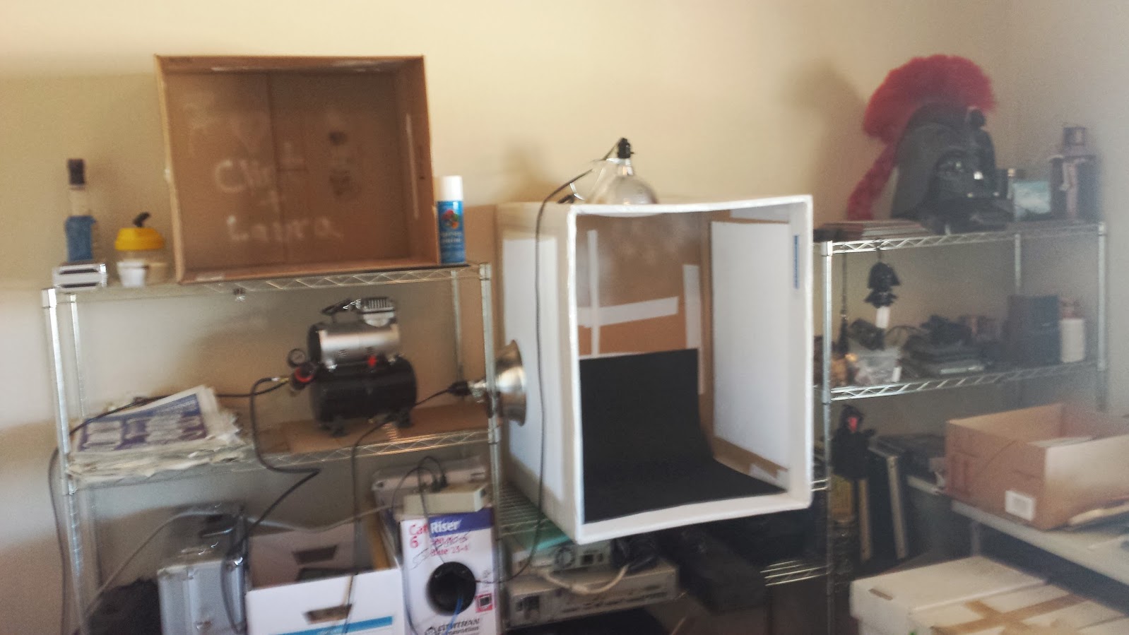 Right. So here’s the other half of the room. Airbrush station and my lightbox (and metric ton of other crap…) The lightbox is what I’ll be working with next. It’s nothing more than a large cardboard box that I cut holes into three sides and then covered those holes with a sheer white cotton fabric. A few worklamps on the sides and top allows a diffuse light to fill the box and eliminate shadows. These days I have a black posterboard shoved in there to act as a background, but I’ve used plain white and some printed “cloudy skies” in the past. So I just stick a mini in there and shoot a bunch of different angles, trying to keep it in the same spot, just rotating it around. Like this…