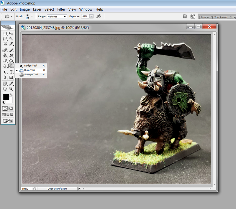 Start on the outer edges and work inwards. I try to not hit the mini itself at all, I’m trying to keep it as close to “real” as I can. I confess to often burning out the sides of the base to blend into the black background, tho’. I find it aesthetically pleasing. Anyhow, it should end up looking something like this: