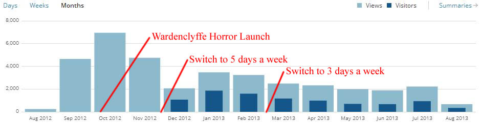 When sign posts are added it makes a bit more sense. As Mr McDonald can no doubt attest to, running publicity for a Kickstarter is a full time operation. For the 5 weeks Wardenclyffe was live, it was very nearly a full time job. Every single day was spent chasing leads and creating buzz in an effort to find our elusive readers. Also, for the first four months of the blog we were posting at least once a day. These two activities combined drove a lot of traffic as you can see, but once that was over, we relaxed into a more manageable five day a week pace until the spring. It took perhaps 6 hours a week to research stories and line up interviews during this time period, and was totally manageable.