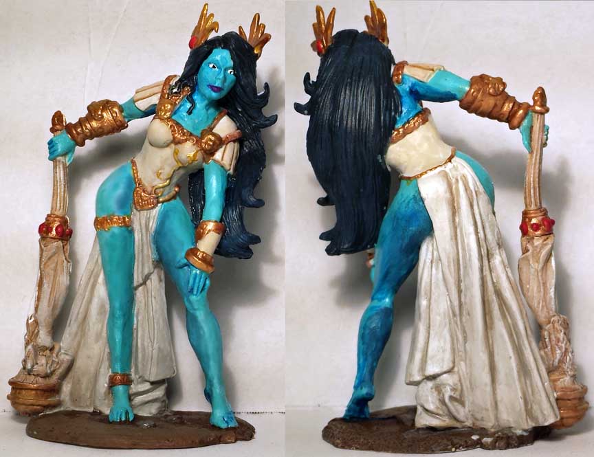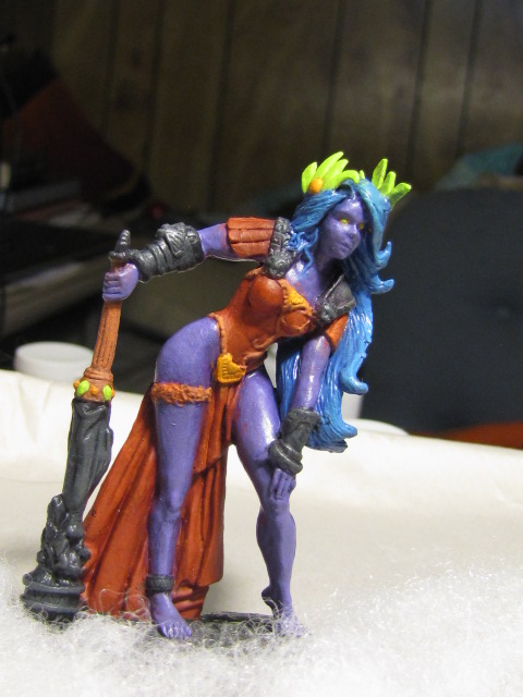 I wasn’t too happy with my work this week. The pics are of the third paint job on this model — the first two were disastrous. Inks wouldn’t behave, my baby blue paint kept turning to chalk and my hands were too damned shaky to do any real details. So that was a rushed eleventh-hour job. My talented wife actually finished up the model, getting rid of stray brushmarks and spots of color, added gems, then did the base for me. Thank you, Laura, for once again saving my biscuits. šŸ™‚