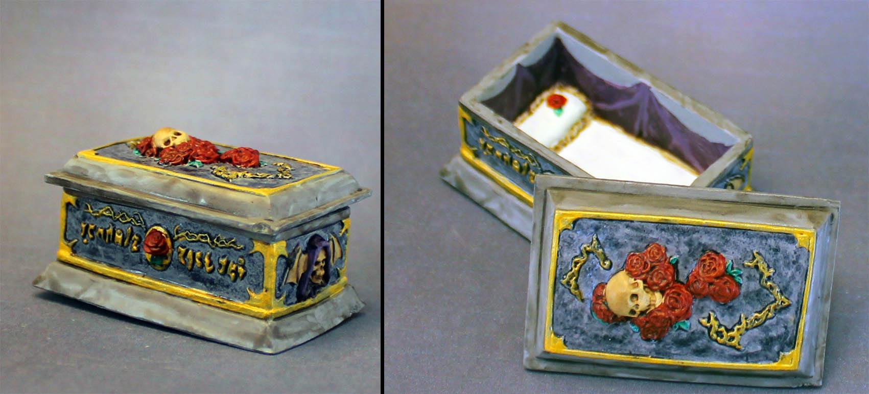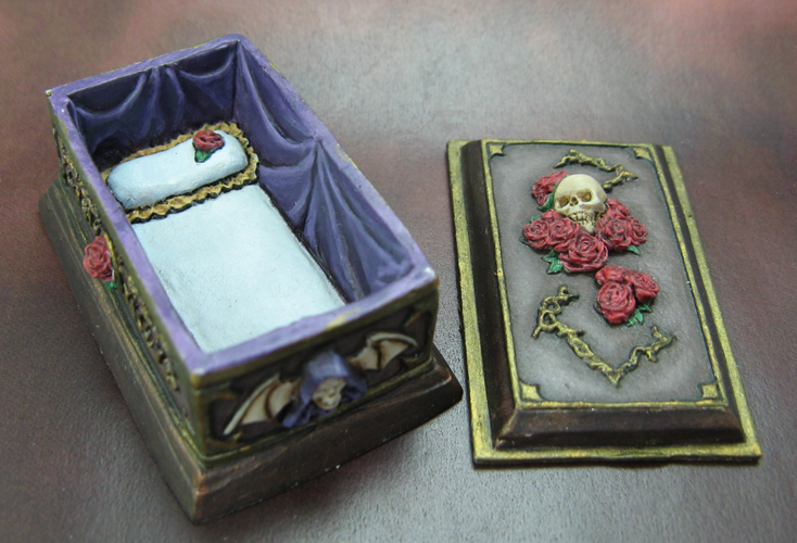 Tonya split the difference with a coffin that is both colorful and grim, and I love her highlights on the cloth interior.
