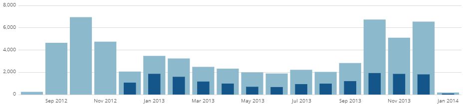 Can you spot the differences? The first spike is the result of active efforts to promote traffic along with the natural traffic that our Kickstarter produced. It was thrilling, short lived, and often difficult to maintain. In seems like half the work that some bloggers do is flogging their own work. The intervening 10 months are more normal traffic – first slowly falling, and then slowly rising. The last three months show what happens when the Monday Miniatures column really starts to take off though. Keep in mind that it had been going on for months, but in October people I have never met started submitting pictures of their work. It was really amazing.