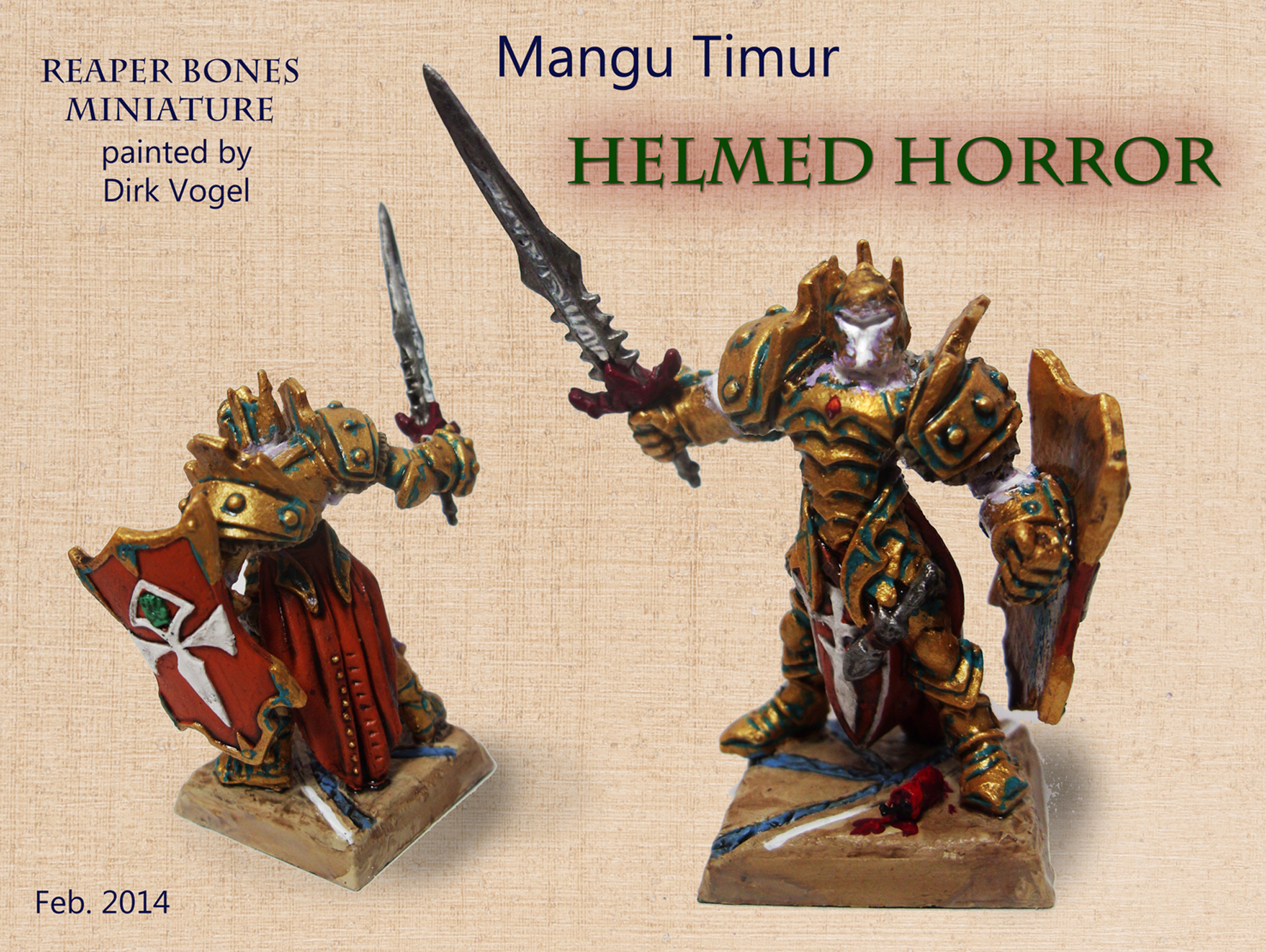 Clint is back to painting and sent us a two-for-one deal this week!  The top is the original Mangu Timur in metal, circa 2001, while the lower is the Bones miniature we’ve all painted.  That brassy armor fits the attitude Mangu is throwing around.