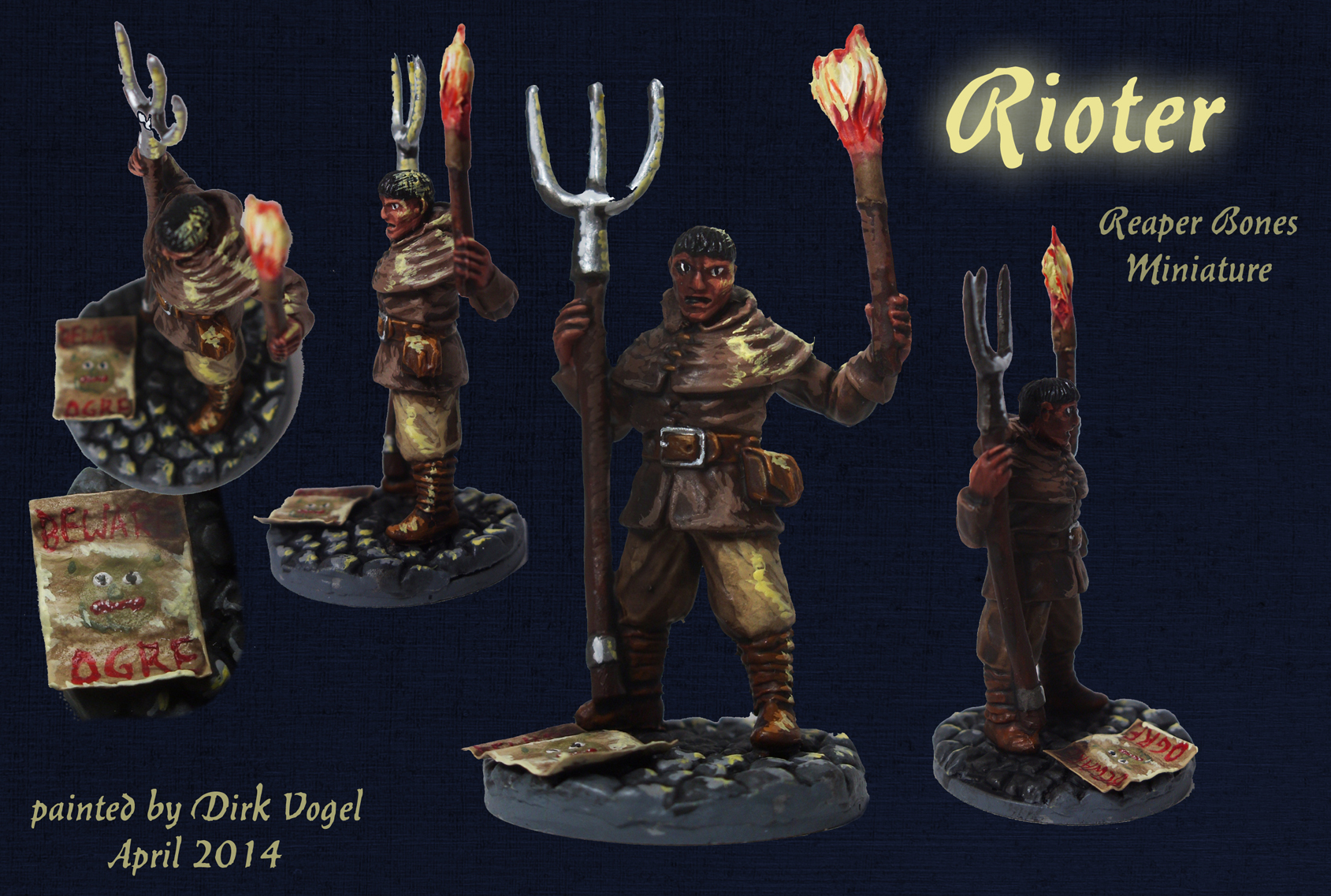 Normally I think that my mini looks better in person than it does in the picture. This time though, the reverse is true. Held in hand, the rioter is colored just a few steps short of Twoface, but according to the camera, even before any kind of photoshop filters are applied, the thing seems to have come out perfect. Sure, the eyes and the pitchfork suck, but this is definitely my best OSL (object source lighting) to date. Glazes did awesome on this guy.