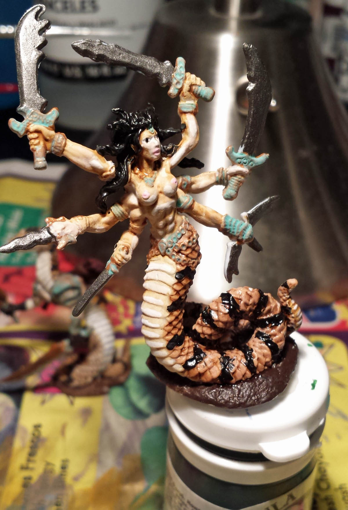 Though I made good progress this week, life proved too hectic for me to complete this particular paint job on time. I want to do a better job on the highlights, the hilts, and some color variation in the scales before I call it good. I chose the same color scheme as an earlier snake mini (pictured in the background) to what I think at least, is a good effect.