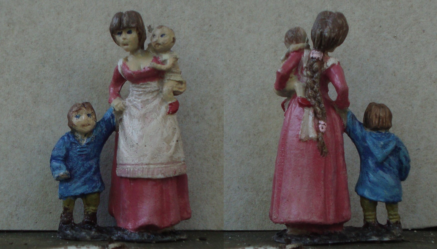I couldn’t tell if the mother was supposed to have sleeves (they’re very slender arms with no details), so I commited to a “sleeveless” look. I started second-guessing myself toward the end, but didn’t want to go back and redo it. At that point, I was feeling kind of “done” with this figure.