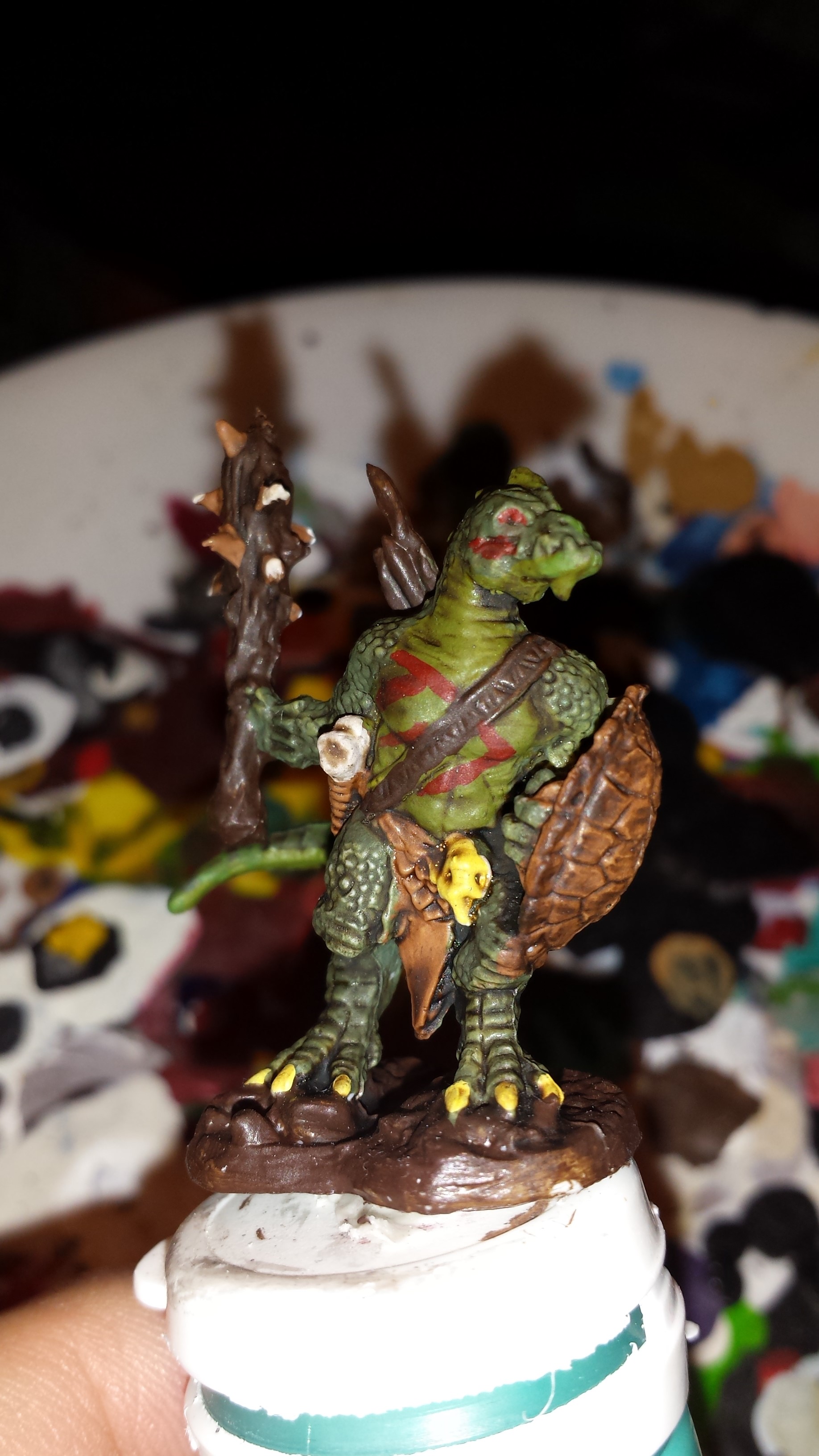 So I spent the weekend working. Fortunately I started this mini last week when I was painting the other lizardman – so if you notice a similarity, that’s why. I’m submitting a WIP because I think this one is only about 80% done. I want to do some highlights on the tail and chest and some patterning on the shield yet.
