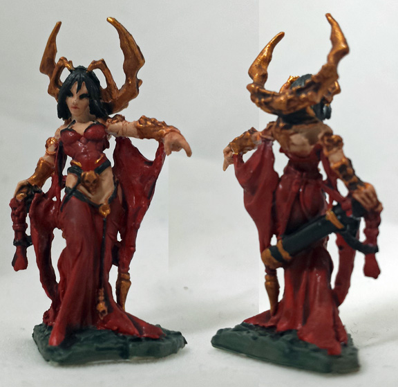 I found that you can spend way to much time on this mini and still have details left. The bones on her bracer somehow did not come out with much contrast, DaveB did a much better job with that, it is hard to recognize the skulls on my mini, DavidW did those better, and so on. I loved to paint this one, though. It is fun to see that Brian managed to paint her as quite a lovely lady. A very versatile mini.
