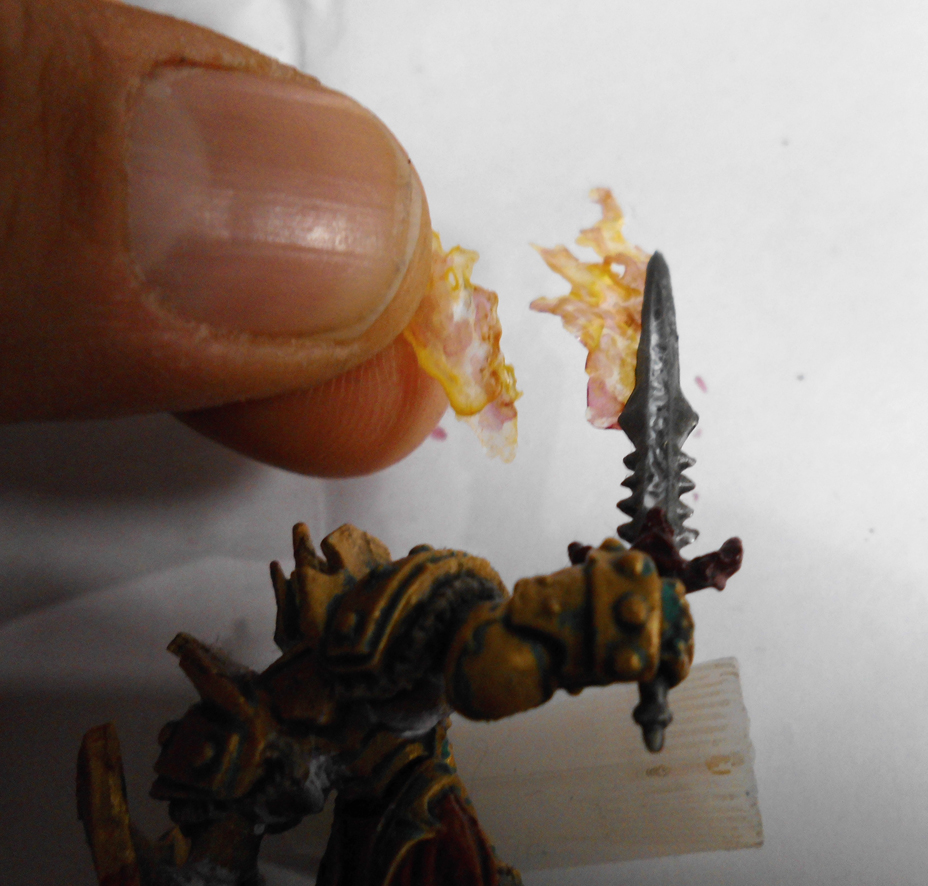 Use an adequate surface to paint the flames, a white one is best to see the real colour. I painted the water effect with a yellow and a red wash to get real flames, but other possibilities exist. There will be some examples later.