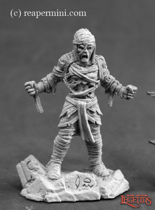 He wrote: “I really like these minis. The scuplts are good and the castings came out with sharp detail. I even like the posing! Admittedly, the female doesn’t really have enough wrapping, but that’s a minor issue. I toyed with the idea of painting her as a living queen, but in the end she joined her counterpart in the world of the undead. When I finished the male, I was pleased with the eerie white eyes, so I stopped there instead of going for red or green. I’m not sure this worked on the female and she feels a little incomplete overall in my opinion.”