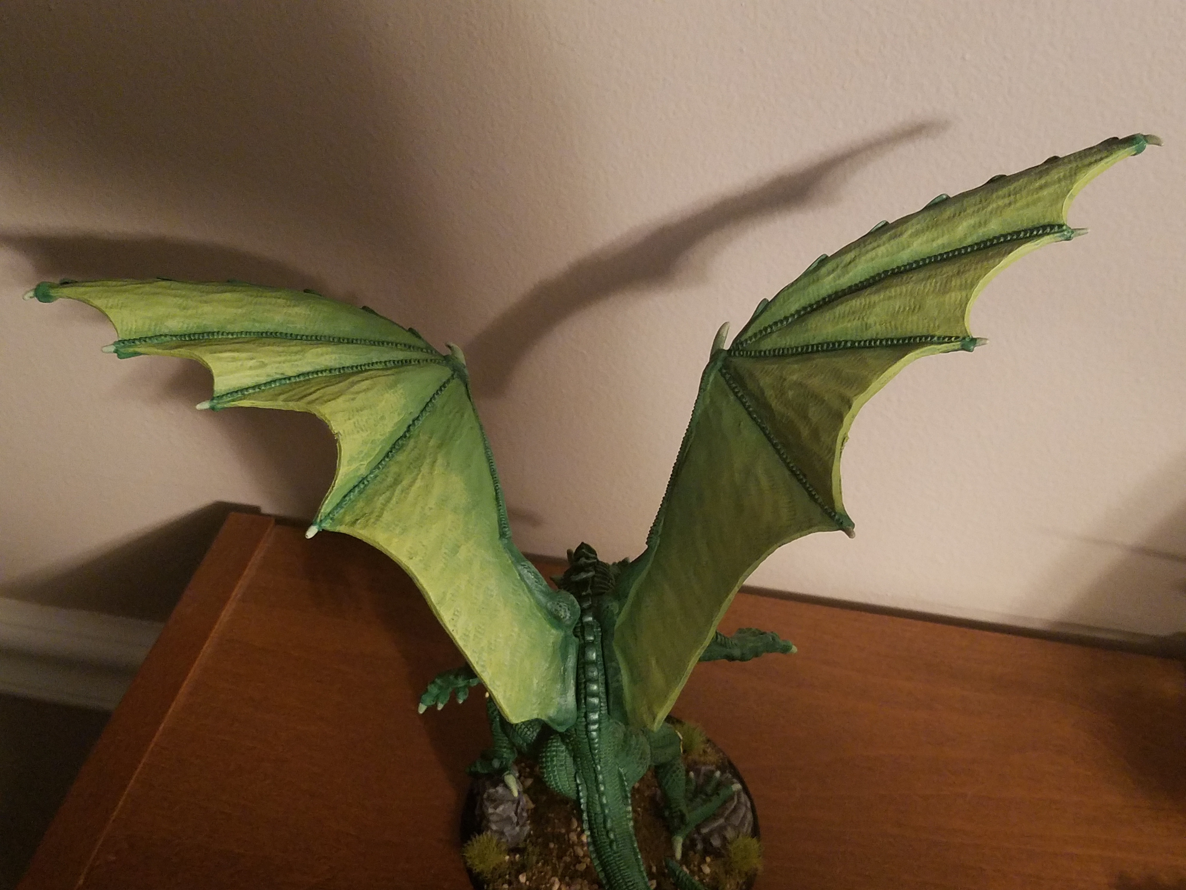 Mine is fairly standard except that I went for a more earthy/olive color on the wing membranes. The idea being that it would help the dragon blend in when on the ground perhaps waiting to ambush prey. I generally find it easier to work on sub-assemblies of a large mini until perhaps 75% done (roughly) and then finish putting it together before ending with the final 25% of the painting. I didn’t find the gaps to be too big, but once I got a bit of gap filling super glue followed by some of my shadow green they are hardly noticeable.