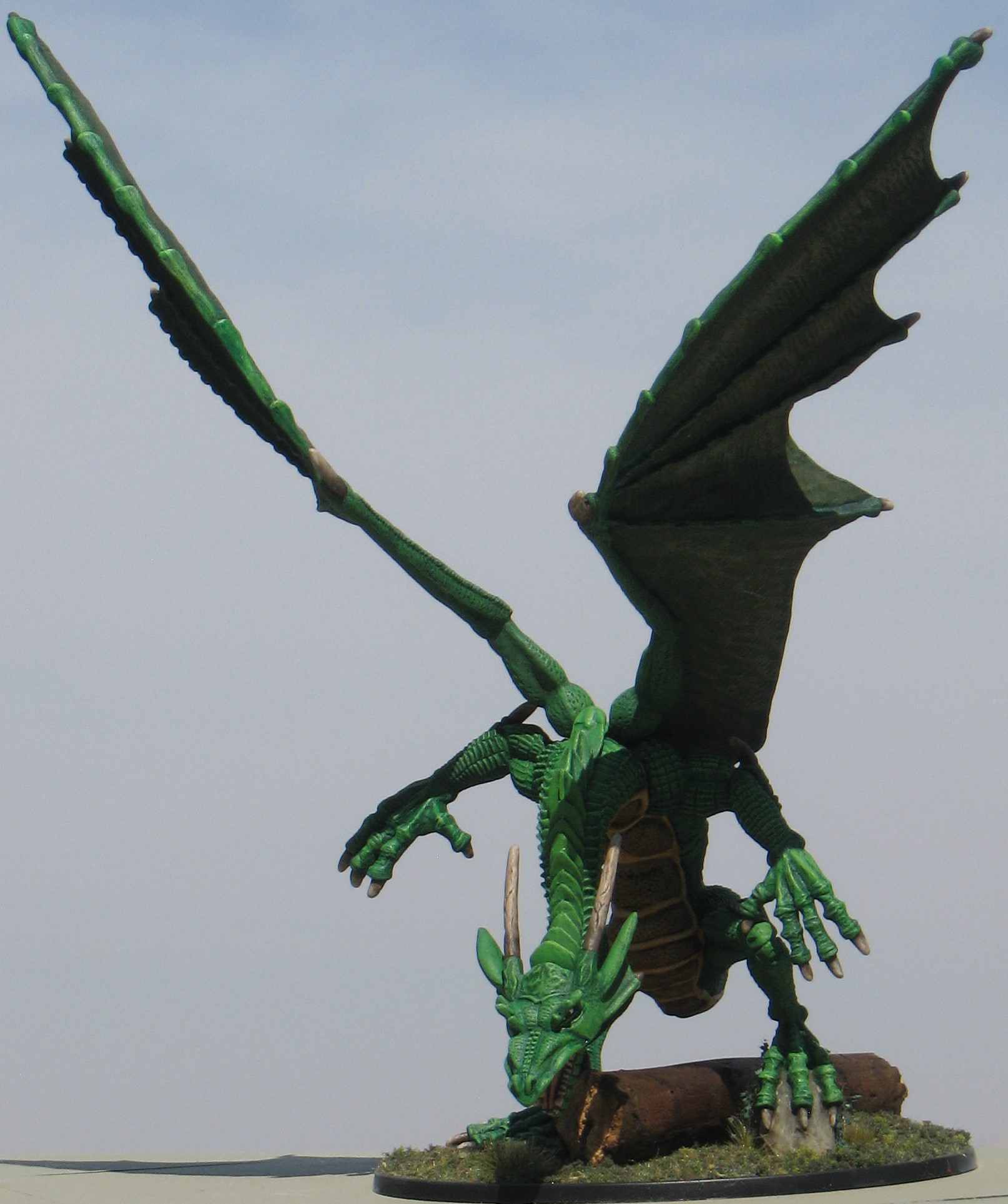 “Here he (she?) is in all his glory, Ha, ha! Not much to add other than I’m happy with the way he came out for tabletop use. Not spectacular but pretty good. The wings seem to have drooped just enough to look good without causing problems. I’m considering a bit more detail on the back side somewhere as he’s a little plain, but then again, I may not do any more. The base came out well with only two criticisms on my part: The base doesn’t give quite as much of a forested feel as I would have liked and I was trying for the effect that Gauth is crashing down his prey and has just knocked over/broken that tree. Not a big problem, but I think the log looks a bit too much like it has been lying there for a while and not freshly felled.”