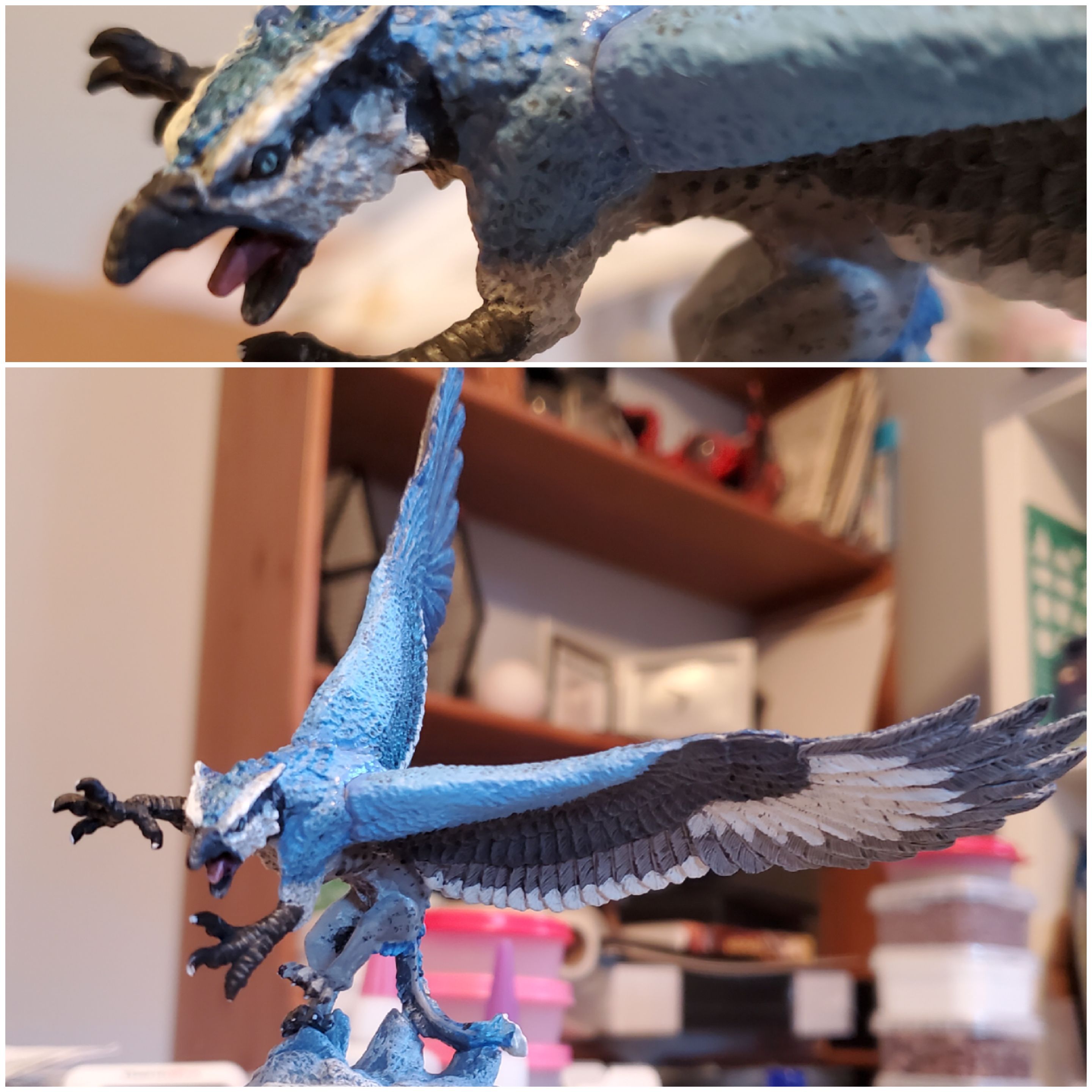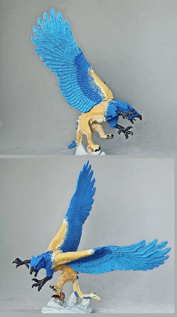 He wanted to use blue and a parrot for the avian part, so he picked the Hyacinth macaw and gave his griffon blue plumage, grey/black feet and beak and the signature yellow around eyes and beak. Since the species lives on the South American continent he chose Jaguar as feline equivalent. The miniature in the picture is still a WIP wthout the characteristic spots, but I think it’s again visible that two bright and even contrasting colors can work well and also look quite natural (in this case at least, which is not as cartoony as mine).