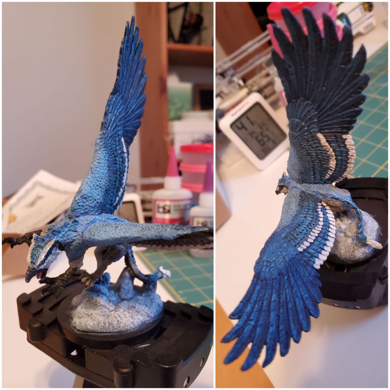 As you can see, I went with a very nontraditional version. I enjoy birding, and I thought I should try for a more interesting songbird pattern on these giant wings. To that end, I painted this like a blue jay, adding in a vaguely lynx-like coat to the cat parts, as well as a green lynx eye. Blue jays are pretty common here in the Eastern United States, but they’re incredibly striking in appearance. I also did a little heat-bending on the tip of the beak to try to straighten it a tad.